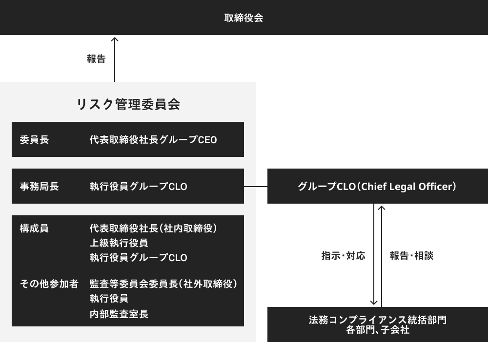 当社は、コンプライアンスの実践体制や運用を規定した「コンプライアンス規程」や、役職員の行動基準を定めた「コンプライアンスポリシー」に基づき、コンプライアンスの推進に努めています。コンプライアンスの推進にあたっては、統括責任者であるグループCLOのもと、法務・コンプライアンス統括部門が主導し、各事業部と連携して進める体制としています。また、代表取締役社長グループCEOを委員長とし、上級執行役員及びグループCLOが参加するリスク管理委員会を四半期に一度開催し、コンプライアンスや腐敗防止に関わる重要事項について討議・方針決定を行っています。委員会では、現実に発生した事象に対する課題のみならず、ヒヤリハット事象も報告され、また社会情勢や事業環境の変化も踏まえた予防的な議論も行われており、企業価値及びステークホルダーの皆さまに影響が大きいコンプライアンス課題に対する取り組みを強化しています。