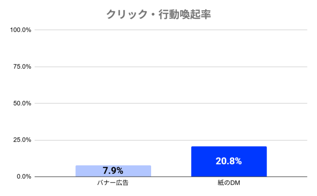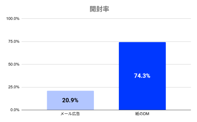 実際に、2024年に実施された日本ダイレクトメール協会の調査*²によると、メール広告の開封率は20.9%、バナー広告のクリック率は7.9%にとどまるのに対し、本人宛てに紙で届いたDMの開封率は74.3%、行動喚起率は20.8%と、非常に高い反応率を誇っています。