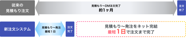 その結果、見積もりから注文完了までにかかる期間は、従来の約1か月から最短でわずか1日へと短縮。人的工数と物流コストの双方を圧縮し、DMをより手軽かつスピーディーに利用できる環境を実現しました。