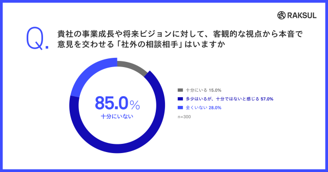 「貴社の事業成長や将来ビジョンに対して、客観的な視点から本音で意見を交わせる『社外の相談相手』はいますか」という質問には、「多少はいるが十分ではない」「全くいない」の合計が85.0%にのぼりました。「十分にいる」と回答したのはわずか15.0%にとどまり、中小企業の経営者・幹部の多くが、相談相手の不足を感じていることが分かりました。