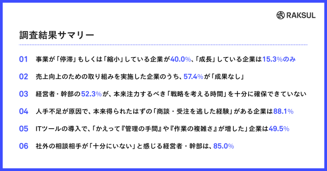 その結果、売上向上や業務効率化の施策を打ちながらも成果につながらない背景に、構造的な課題があることが明らかになりました。本調査の詳細は全5回に分けてお伝えします。第1回となる本リリースでは、調査結果のサマリーをご紹介します。