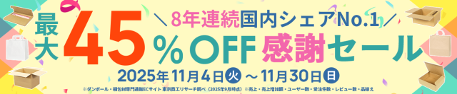 2025年11月4日(火)〜2025年11月30日(日)の期間、No.1を記念してこれまでのご愛顧の感謝を込めて「8年連続国内シェアNo.1感謝セール」を開催いたします。開催期間中は人気の定番商品を中心にダンボール・梱包材を最大45%OFFで販売いたします。